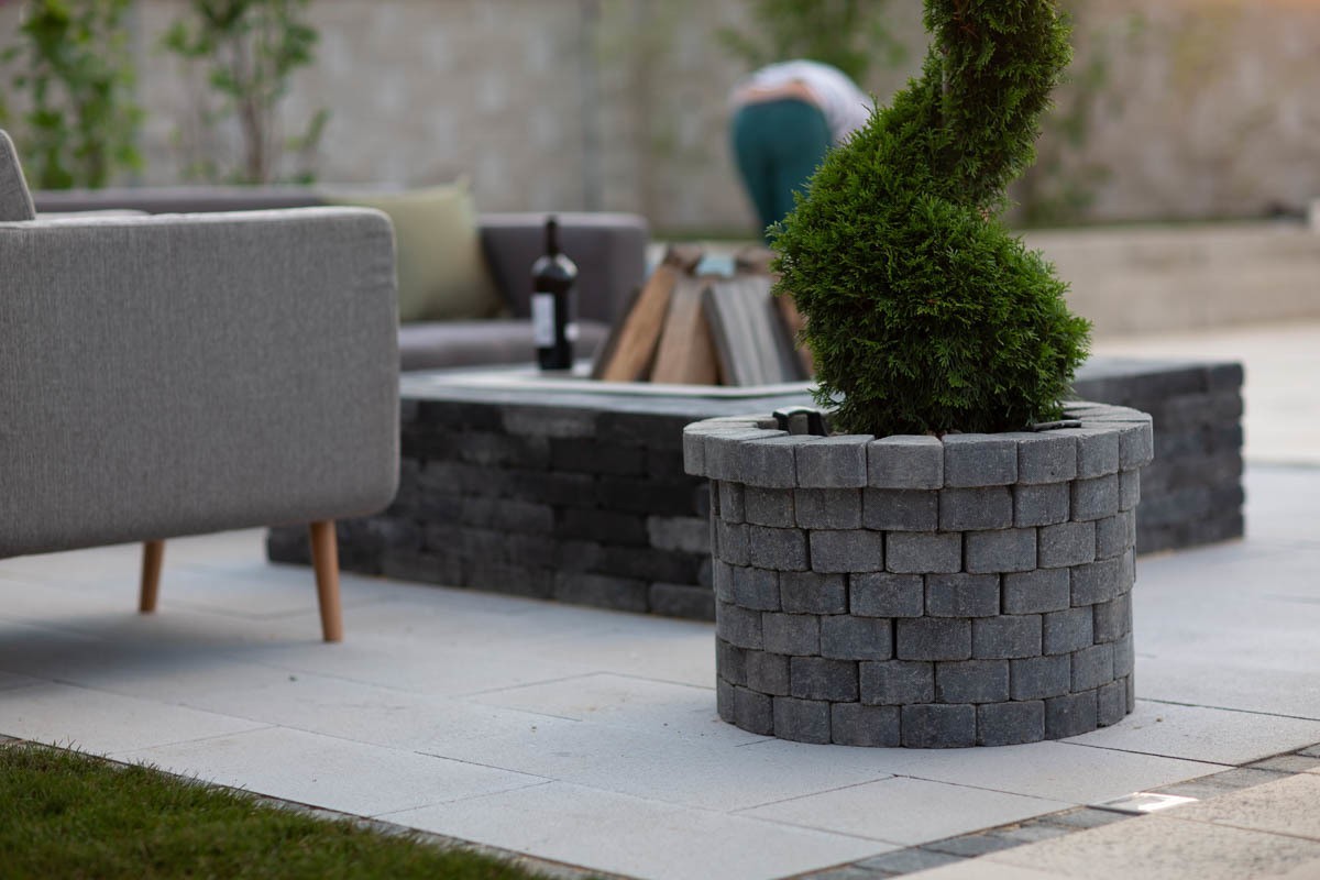 Elemente decorative de tip jardiniere pot fi realizate din diverse tipuri de pavele, pentru a crea combinatii adecvate spatiului tau. Construit din bucati de pavele Conic Antico, modelul Ronda este recomandat pentru spatiile cu linii rotunjite, carora le imprima un aer romantic.