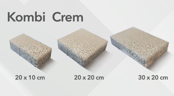 Pavajul Kombi este o combinație de trei dimensiuni cu ajutorul caruia poti crea montaje unice si diferite. Produsul se comercializeaza doar in pachet standard cu suprafata de 1,08 mp. Un pachet este format din 6 buc de 30x20 cm, 12 buc de 20x20 cm si 12 buc de 20x10 cm.