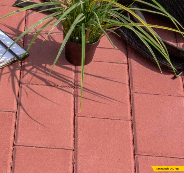 Pavaj Dreptunghi D9 21x14x8 cm. Un nou model clasic, care ramane mereu in tendintele de amenjari exterioare. Este recomandat pentru amenajarea spatiilor publice ample, de exemplu parcuri, piete, alei si zone acces auto, precum si a spatiilor private: curti, terase, sedii de magazine.