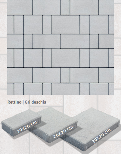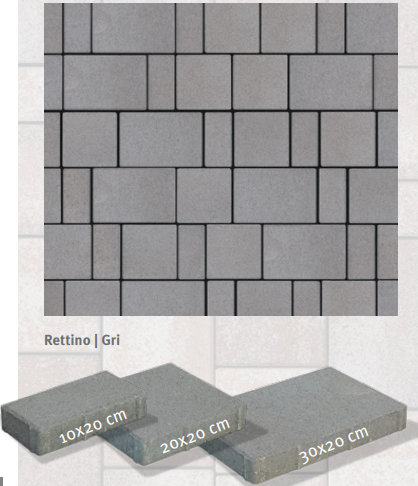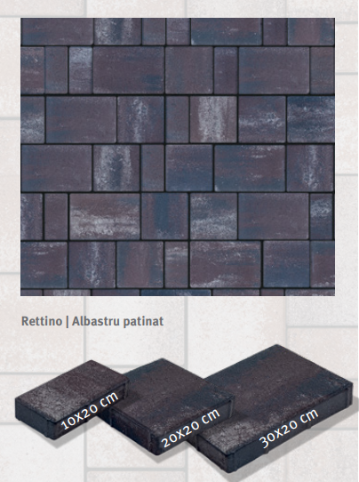 Pavajul Rettino reprezinta libertate. Libertatea de a te juca cu nuante si forme, astfel incat rezultatul final sa oglindeasca perfect viziunea ta. Rettino iti ofera oportunitatea de a-ti personaliza gradina fara constrangeri, transformand-o intr-un spatiu intim si calduros, de o frumusete inegalabila. Pachetul de baza = 16.20 m² si cuprinde: 12 buc - 10x20x4 cm; 12 buc - 20x20x4 cm si 6 buc - 30x20x4 cm.