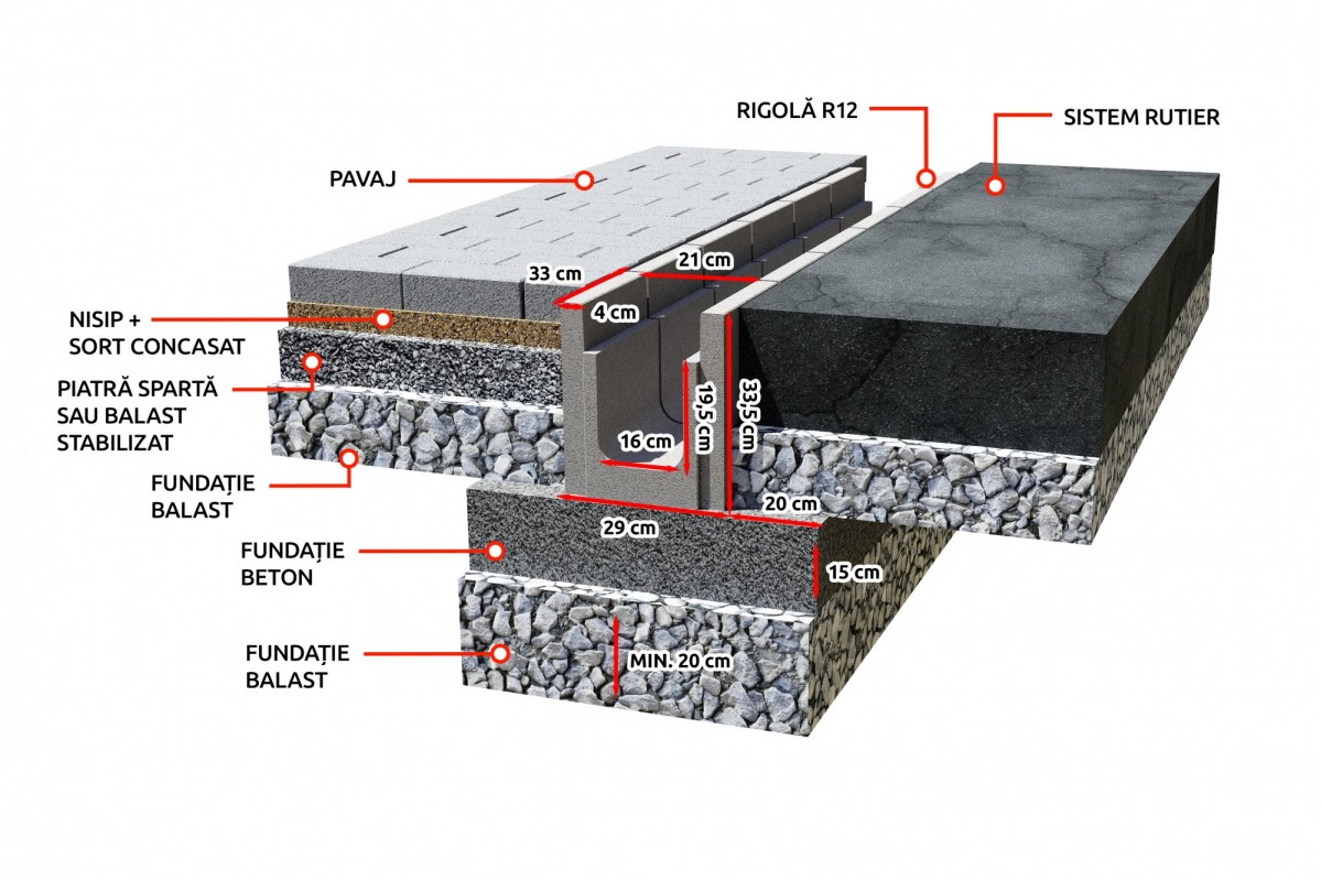 Suprafetele amenajate vor fi mentinute curate si functionale pe orice fel de vreme prin sistemul de rigole montat pe marginile trotuarelor, strazilor sau ale curtilor. Avand forme si dimensiuni variate, rigolele sunt concepute astfel incat sa se potriveasca specificului terenului si sa fie perfect compatibile cu modelul de pavaj ales, pentru diferite destinatii. Produsul se utilizeaza pentru colectarea apelor pluviale.