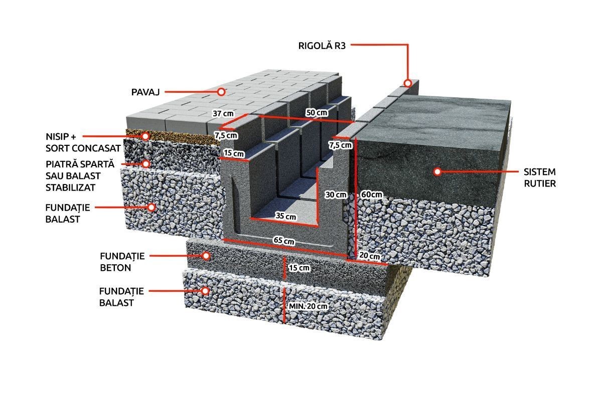 Suprafetele amenajate vor fi mentinute curate si functionale pe orice fel de vreme prin sistemul de rigole montat pe marginile trotuarelor, strazilor sau ale curtilor. Avand forme si dimensiuni variate, rigolele sunt concepute astfel incat sa se potriveasca specificului terenului si sa fie perfect compatibile cu modelul de pavaj ales, pentru diferite destinatii. Produsul se utilizeaza pentru colectarea apelor pluviale.